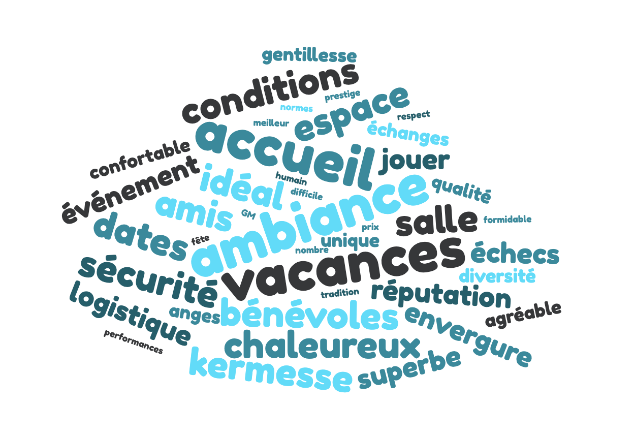 Le premier point qui ressort des réponses est l'aspect humain : la possiblité de revoir de nombreux amis, d'échanger avec des joueurs connus ou inconnus, d'affronter des joueurs que l'on ne peut pas affronter ailleurs, sans oublier la qualité de l'accueil des bénévoles cappellois. Le deuxième aspect concerne le caractère particulier de cet open mondialement connu : la réputation, l'envergure, le nombre de joueurs titrés et de pays représentés, la possibilité de faire des normes. Enfin, le troisième point concerne le confort dont vous bénéficiez durant notre tournoi pour jouer aux échecs dans les meilleurs conditions.