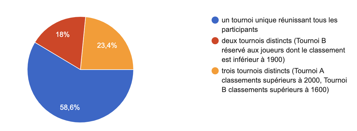 Il était intéressant de recueillir l'avis des participants sur le fait de maintenir un seul tournoi ou de scinder l'ensemble en deux ou trois tournois. Les résultats que vous voyez ci-dessous seront analysés et pris en compte dans la préparation des futures éditions.